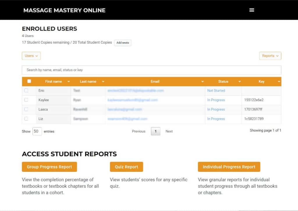 At Massage Mastery Online you can monitor student progress to the level you desire. You can confirm if they’ve read an assigned topic or check what questions they got right or wrong on any quiz.Â