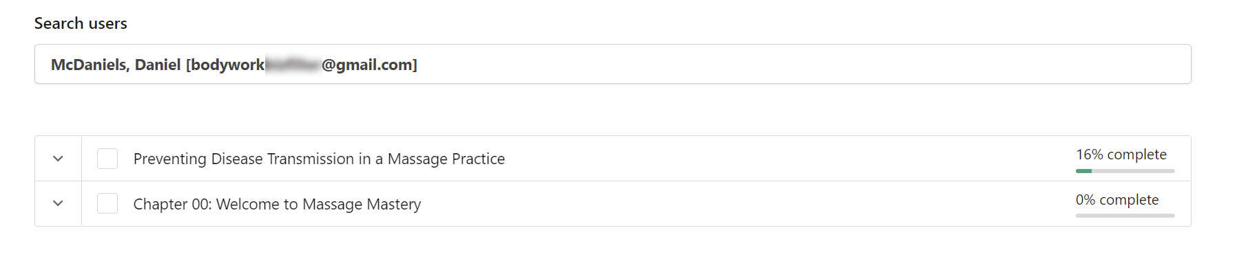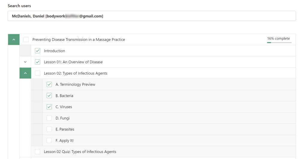 If you want to manually mark a Lesson or Topic as completed for that student, simply click in the checkbox next to the title and the change will be made automatically.