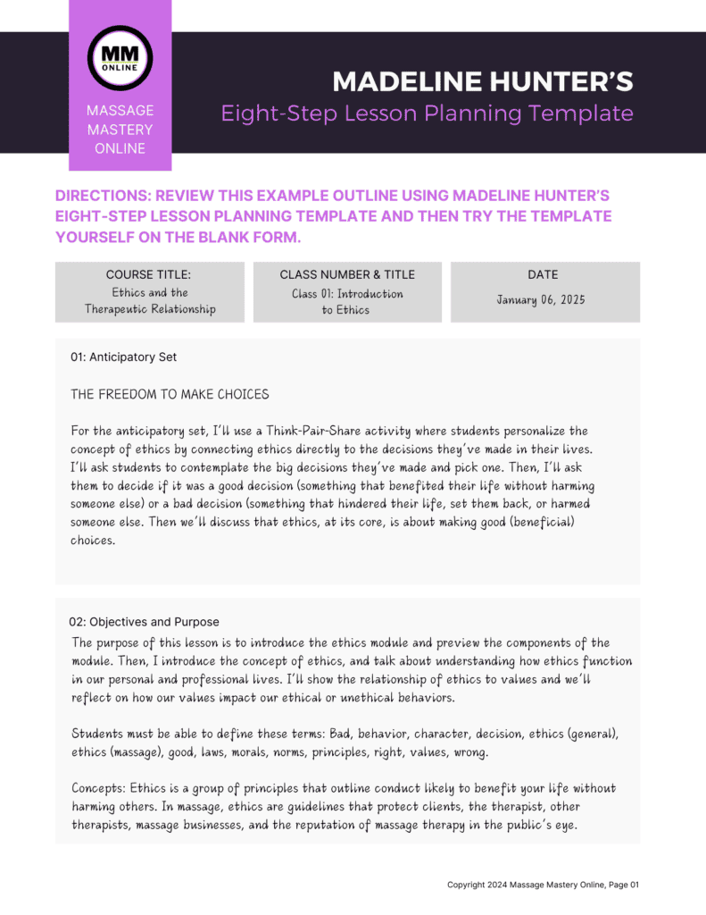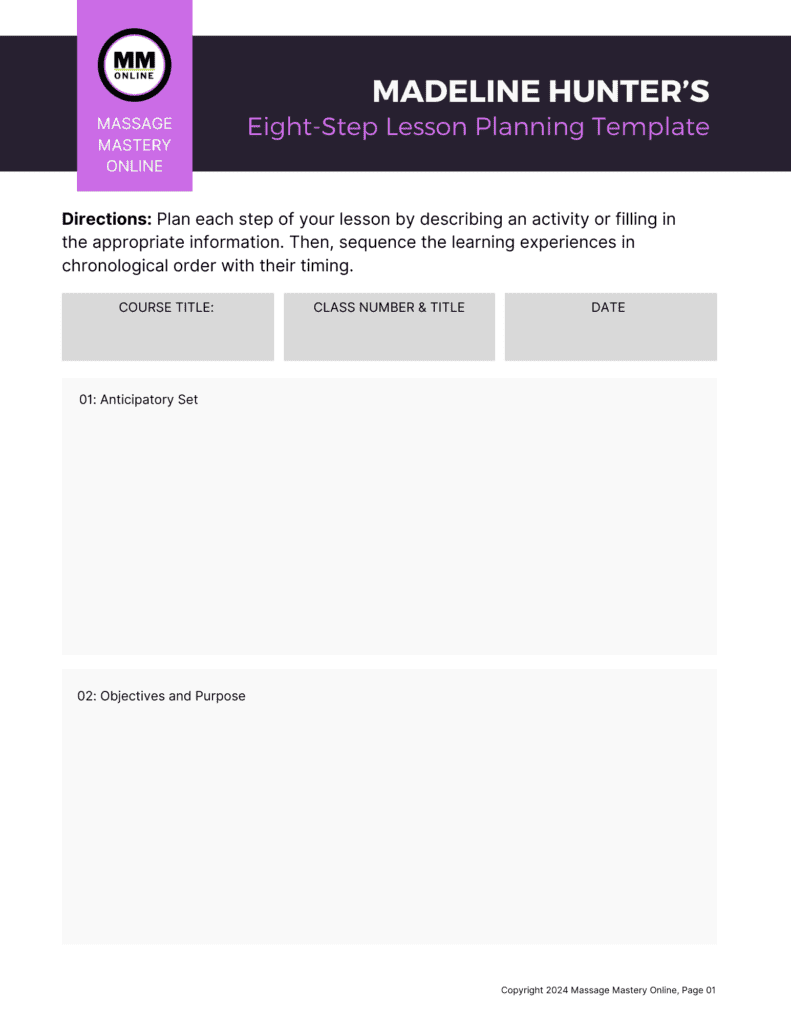 Step Eight – Closure: While formal closure wasn’t part of Hunter’s original model, she evolved to feel that it was important to plan for structured closing events where students discussed their learning or participated in activities to summarize lesson content. Examples include journaling about how the lesson applies to their understanding of massage therapy or their personal life or asking learners to share a key takeaway. If you’ve taken the 40 Activities to Anchor Student Learning course, you know several methods to close classes.