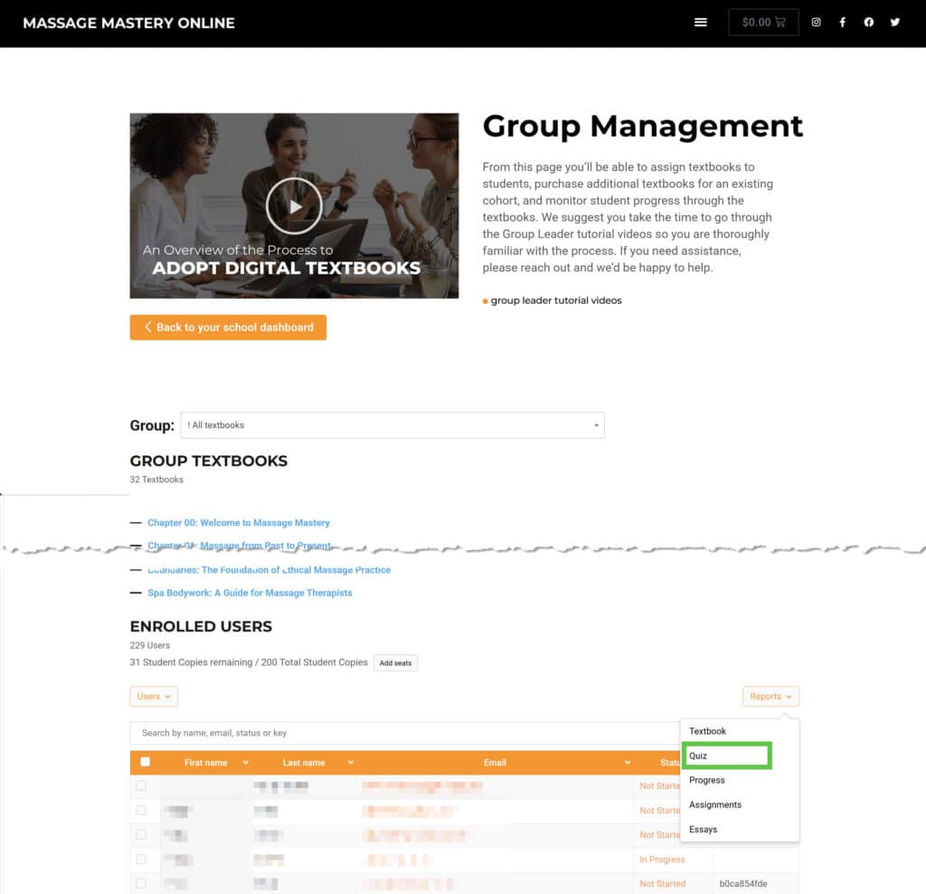 3. Open the Reports dropdown and select Quiz (you can also find this at the bottom of the Group Management page).