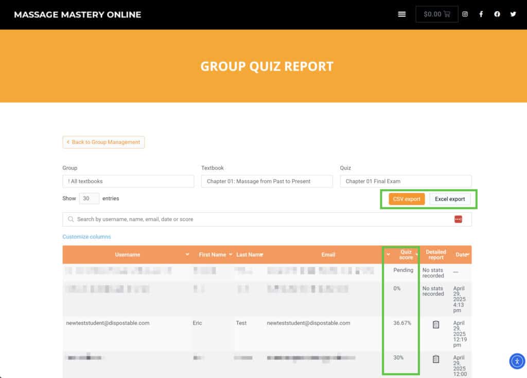 5. You can view scores directly in the Quiz Score column or download a CSV or Excel spreadsheet of the results.